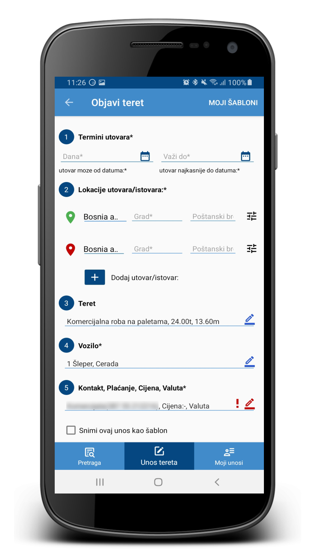 In the cargo section at the bottom of the page there is an option 'Enter cargo'. You can simply enter the details of the cargo to be transported. You also have the option to save each load entry as a template for the same route. That way, you don't need to re-enter the same data the next time it's the same relationship. This functionality facilitates and speeds up the cargo posting process. If you have any questions or need additional information, our customer support team will be happy to help.
